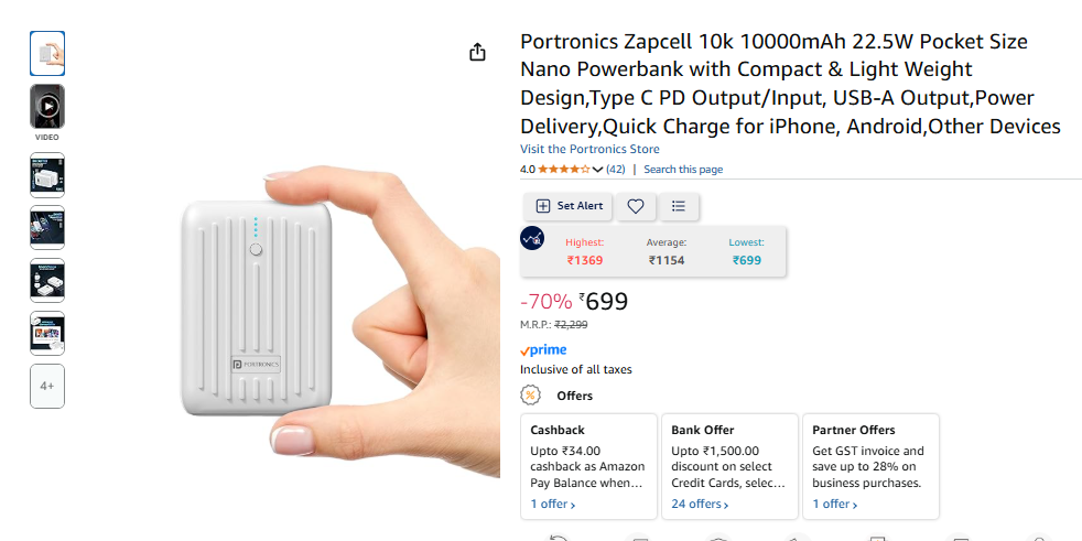 Portronics Zapcell 10k 10000mAh 22.5W Pocket Size Nano Powerbank with Compact & Light Weight Design,Type C PD Output/Input, USB-A Output,Power Delivery,Quick Charge for iPhone, Android,Other Devices