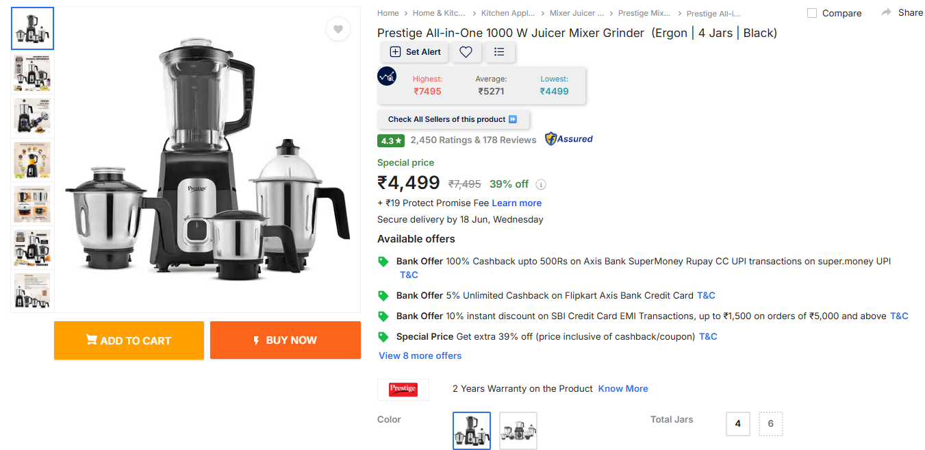 Prestige All-in-One 1000 W Juicer Mixer Grinder (Ergon | 4 Jars | Black)