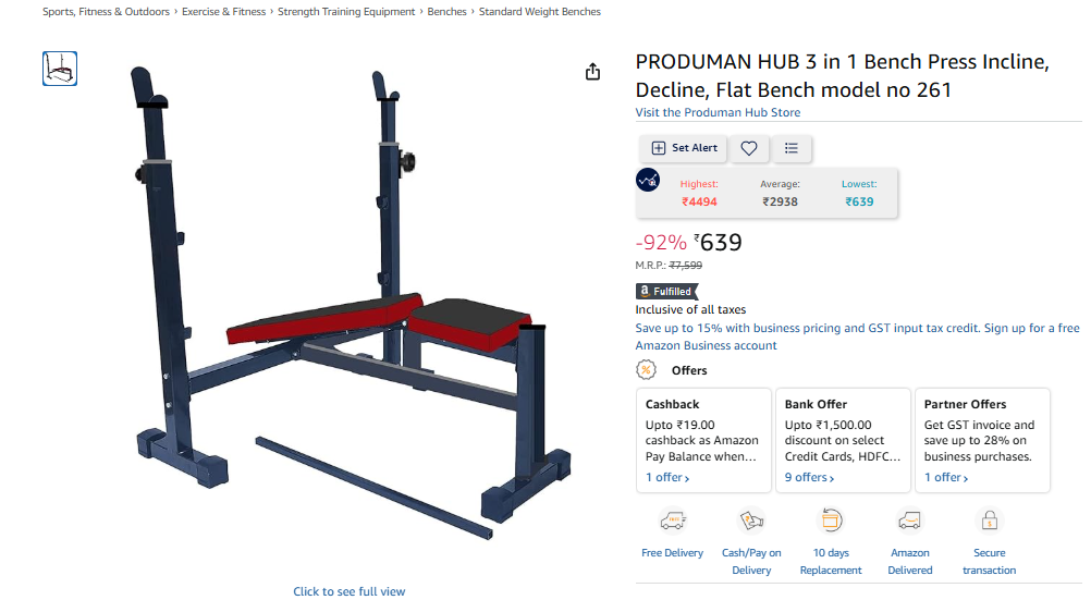 PRODUMAN HUB 3 in 1 Bench Press Incline, Decline, Flat Bench model no 261