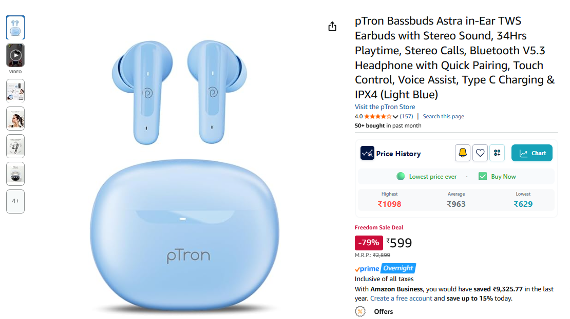 pTron Bassbuds Astra in-Ear TWS Earbuds with Stereo Sound, 34Hrs Playtime, Stereo Calls, Bluetooth V5.3 Headphone with Quick Pairing, Touch Control, Voice Assist, Type C Charging & IPX4 (Light Blue).