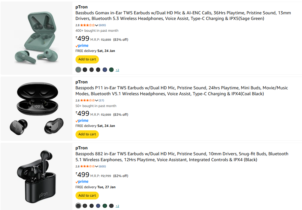pTron Earbuds at Up to 87% Discount | Starting at ₹499, Available on Amazon.