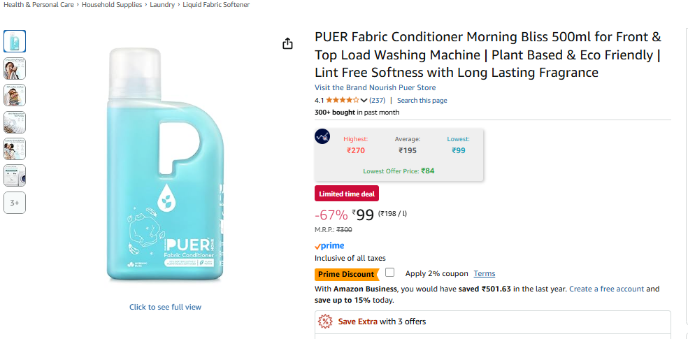 PUER Fabric Conditioner Morning Bliss 500ml for Front & Top Load Washing Machine | Plant Based & Eco Friendly | Lint Free Softness with Long Lasting Fragrance.
