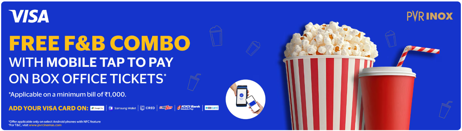 PVR INOX Cinema is running an offer where you will get a Free F&B Combo with Visa Tap to Pay on Mobile at Box Office Ticket Purchases.