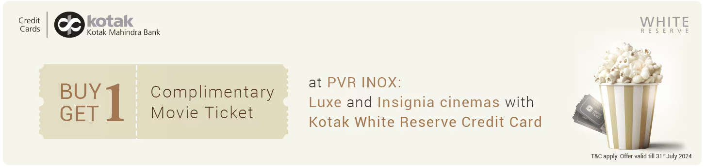 PVR INOX Cinema is running an offer where you will get Buy 1 Get 1 on Movie Tickets with Kotak Bank White Reserve Card.
