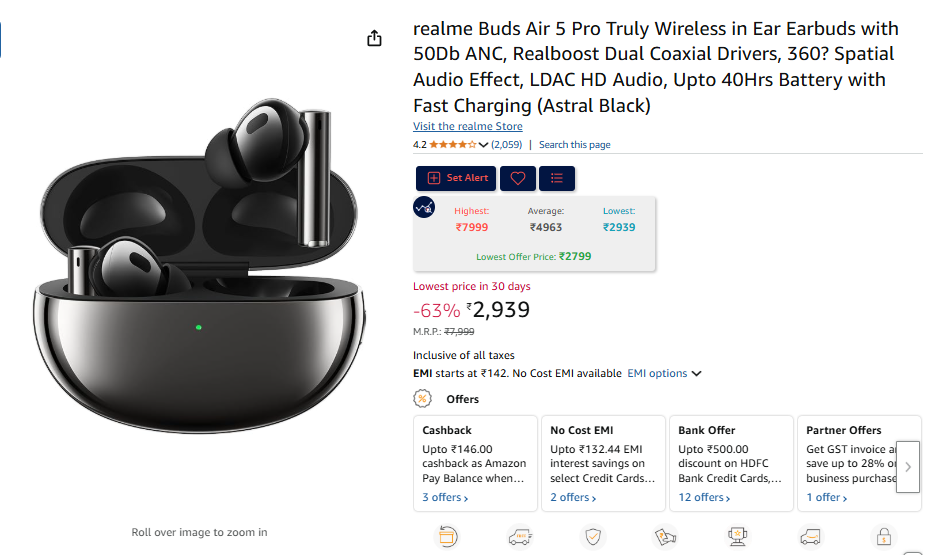 realme Buds Air 5 Pro Truly Wireless in Ear Earbuds with 50Db ANC, Realboost Dual Coaxial Drivers, 360? Spatial Audio Effect, LDAC HD Audio, Upto 40Hrs Battery with Fast Charging (Astral Black)
