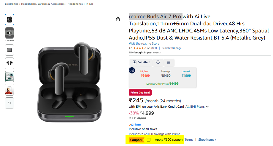 realme Buds Air 7 Pro with Ai Live Translation,11mm+6mm Dual-dac Driver, 48 Hrs Playtime, 53 dB ANC, LHDC, 45Ms Low Latency, 360° Spatial Audio, IP55 Dust & Water Resistant, BT 5.4 (Metallic Grey) is available on Amazon.