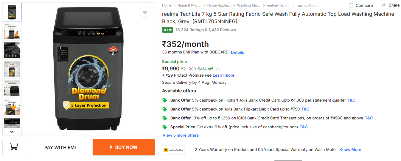 realme TechLife 7 kg 5 Star Rating Fabric Safe Wash Fully Automatic Top Load Washing Machine Black, Grey (RMTL705NNNEG)