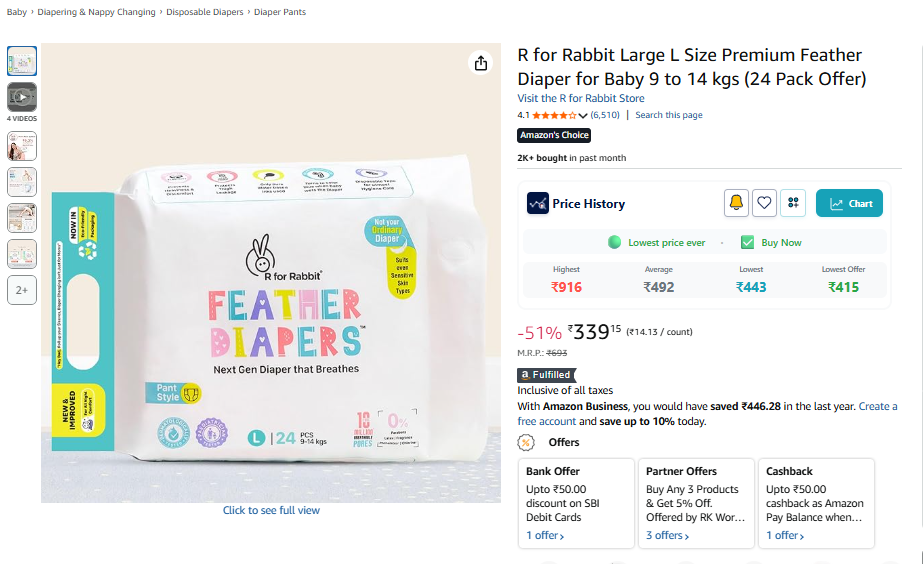 R for Rabbit Large L Size Premium Feather Diaper for Baby 9 to 14 kgs (24 Pack Offer).