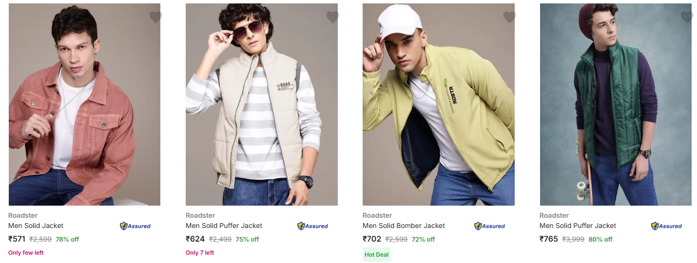 Roadster Men's Jackets upto 80% Discount is available on Flipkart.