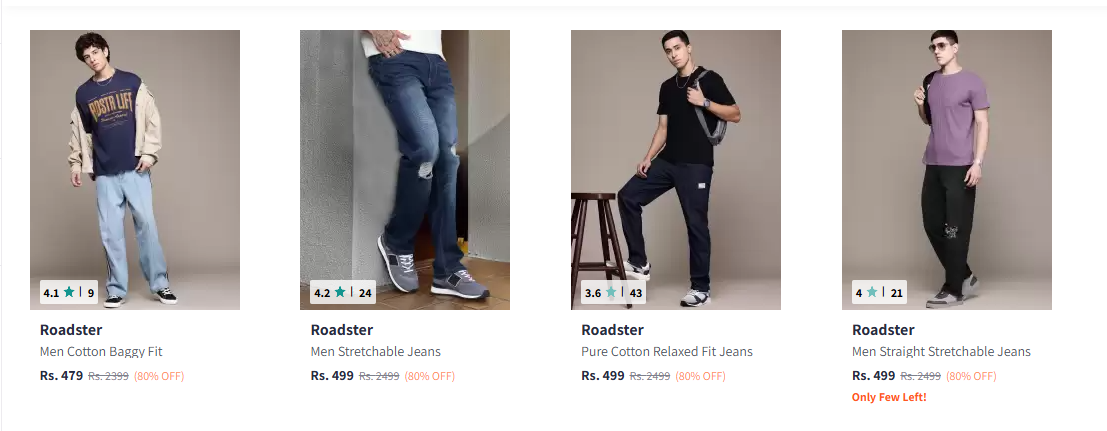 Roadster Men's Jeans at Minimum 80% Discount is available @ Amazon
