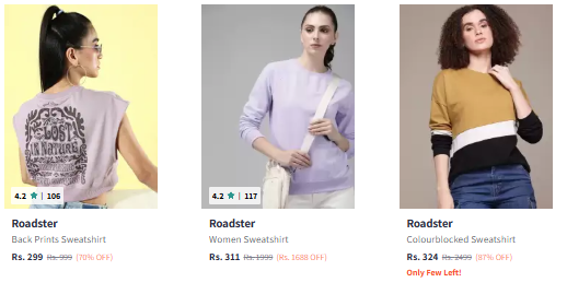 Roadster Sweatshirts Starting @ ₹299 available online in India at an offer price of ₹299 on Myntra. Discounted Price: ₹299. This deal was updated by @ruchika on 13th October, 2025 at 5:27 PM.