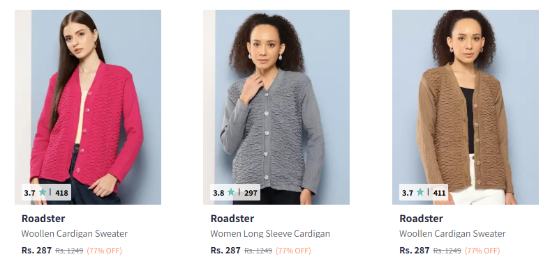 Roadster Women Woollen Cardigan Sweater Starting at ₹287 available online in India on Myntra. This deal was updated by @sawai on 21st November, 2025 at 1:33 AM.