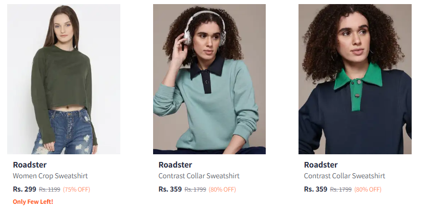 Roadster Women's Sweatshirts starting at ₹299 is available on Myntra.