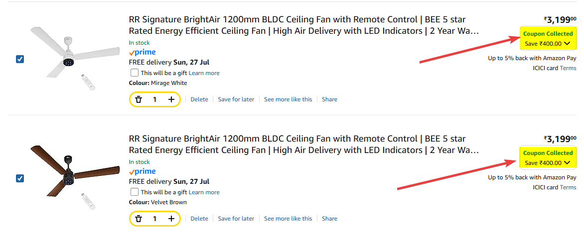 RR Signature BrightAir 1200mm BLDC Ceiling Fan with Remote, BEE 5 Star Rated, Available on Amazon.