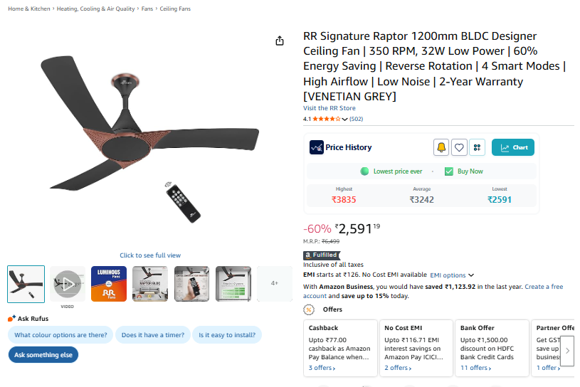 RR Signature Raptor 1200mm BLDC Designer Ceiling Fan | 350 RPM, 32W Low Power | 60% Energy Saving | Reverse Rotation | 4 Smart Modes | High Airflow | Low Noise | 2-Year Warranty [VENETIAN GREY].