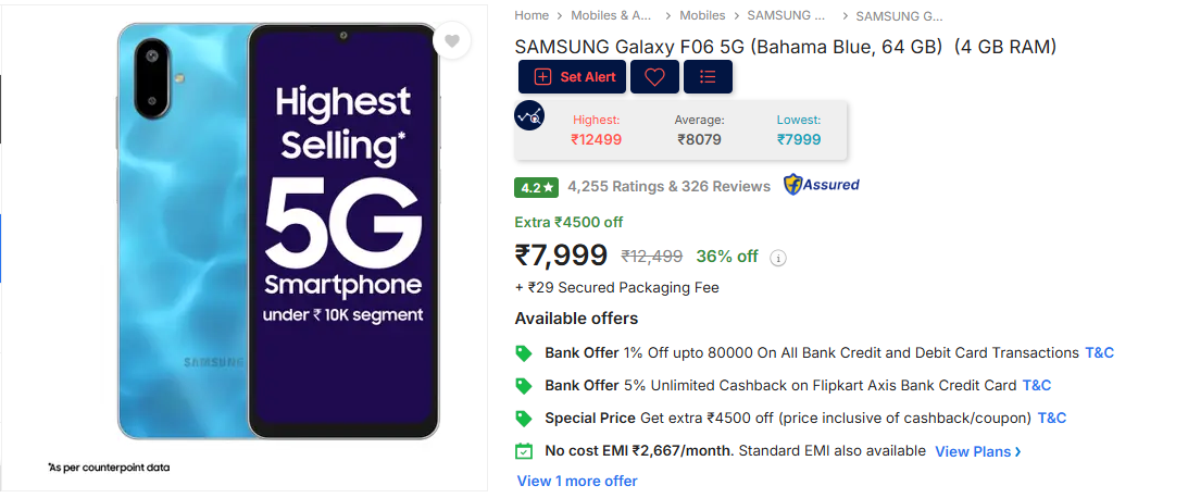 SAMSUNG Galaxy F06 5G (Bahama Blue, 64 GB) (4 GB RAM) is available on Flipkart.