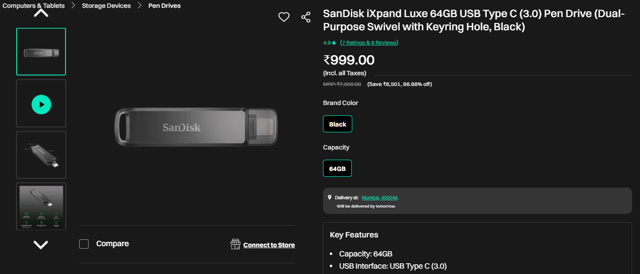 SanDisk iXpand Luxe 64GB USB Type C (3.0) Pen Drive (Dual-Purpose Swivel with Keyring Hole, Black).