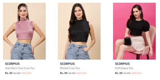 Scorpius Top Starting @ ₹99 available online in India at an offer price of ₹99 on Myntra. Discounted Price: ₹99. This deal was updated by @ruchika on 17th October, 2025 at 10:19 AM.