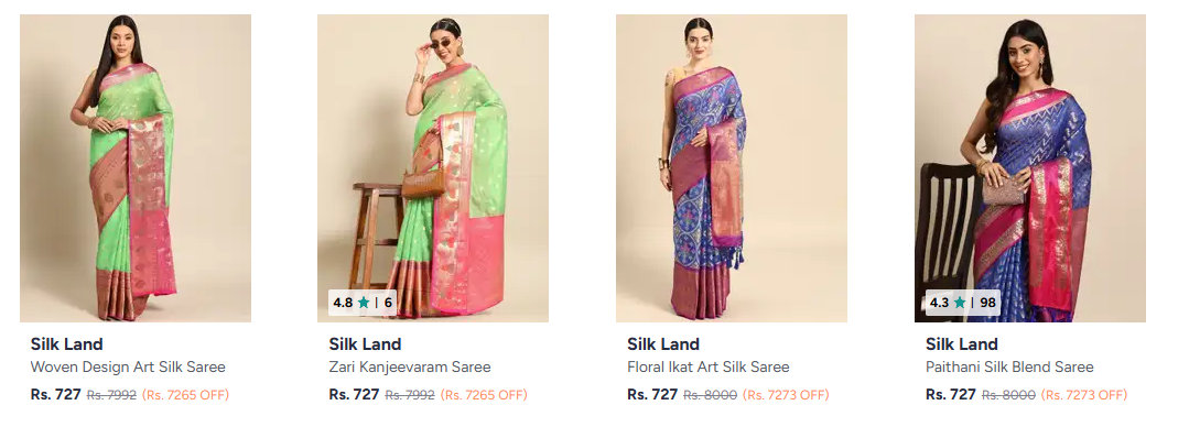 Silk Land Women's Saree at minimum 90% Discount available online in India (90% discount from MRP) on Myntra. Discount: 90%. This deal was updated by @radhika on 14th March, 2026 at 5:58 PM.