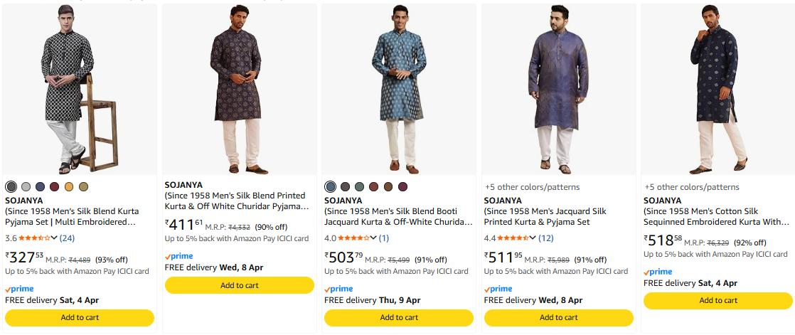 SOJANYA Men's Kurta at minimum 90% Discount