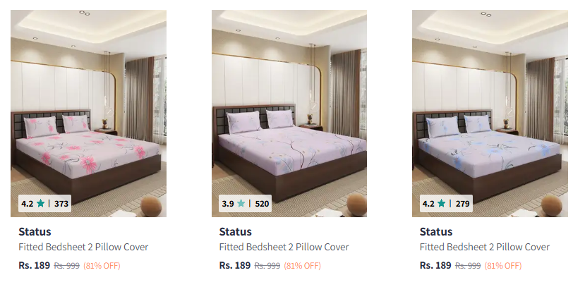 Status Bedsheets upto 80% Discount | Starting at ₹189 is available on Myntra.