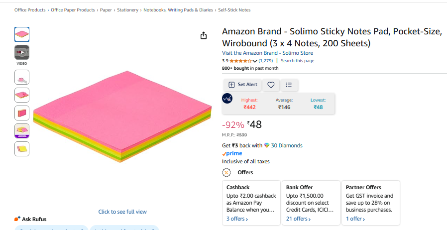 Amazon Brand - Solimo Sticky Notes Pad, Pocket-Size, Wirobound (3 x 4 Notes, 200 Sheets)