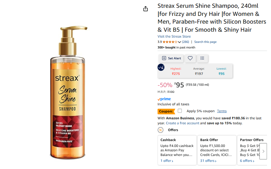 Streax Serum Shine Shampoo, 240 ml for Frizzy and Dry Hair | Paraben-Free With Silicon Boosters & Vit B5 | Controls Frizz, for Smooth & Shiny Hair