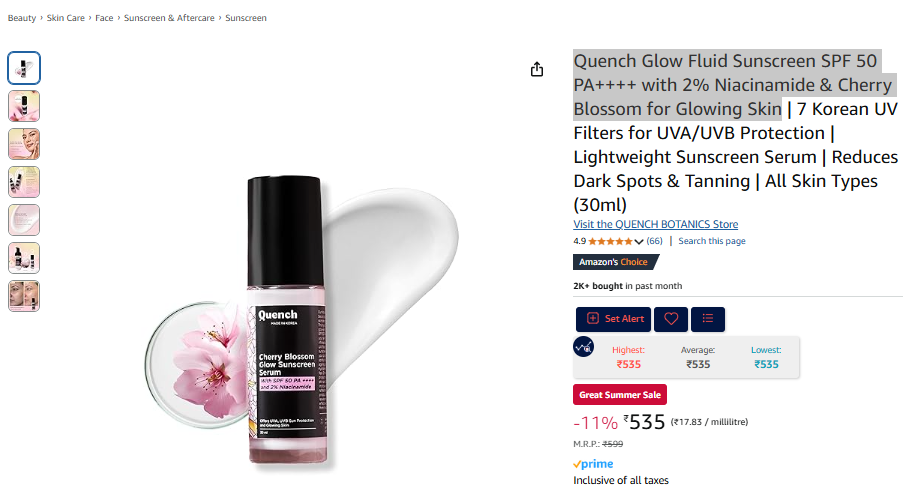 Free Benifit item : Quench Glow Fluid Sunscreen SPF 50 PA++++ with 2% Niacinamide & Cherry Blossom for Glowing Skin