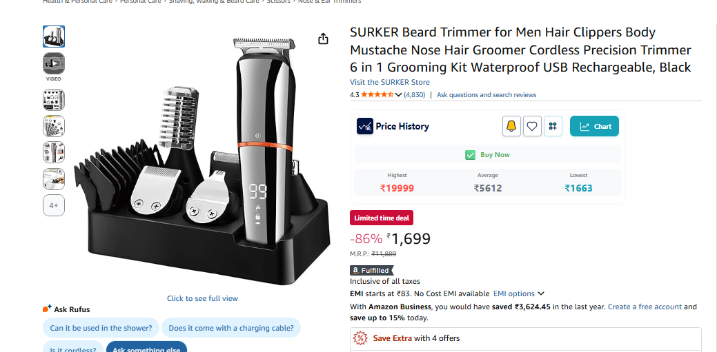 SURKER Beard Trimmer for Men Hair Clippers Body Mustache Nose Hair Groomer Cordless Precision Trimmer 6 in 1 Grooming Kit Waterproof USB Rechargeable, Black