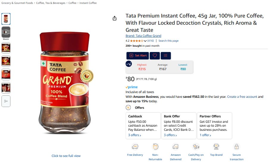 Tata Premium Instant Coffee, 45g Jar, 100% Pure Coffee, With Flavour Locked Decoction Crystals, Rich Aroma & Great Taste.
