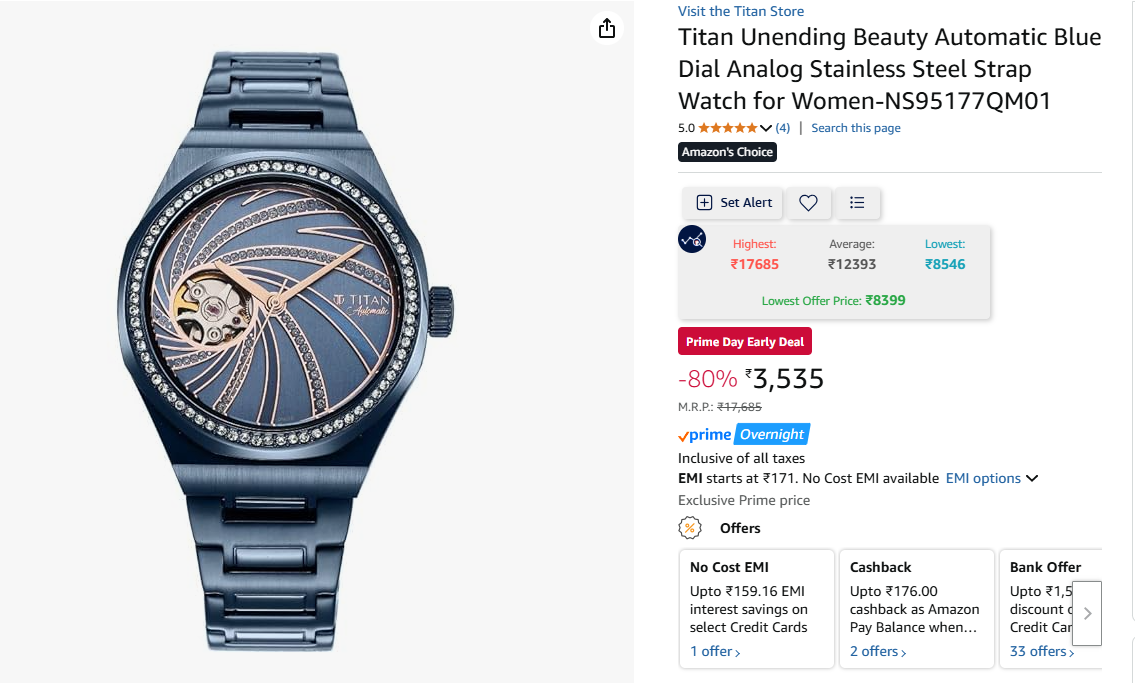 Titan Quartz Analog Blue Dial Stainless Steel Strap Watch for Women-NS95163QM02