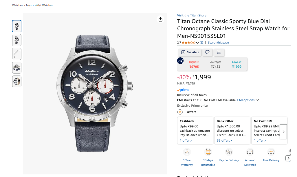 Titan Octane Classic Sporty Blue Dial Chronograph Stainless Steel Strap Watch for Men-NS90153SL01