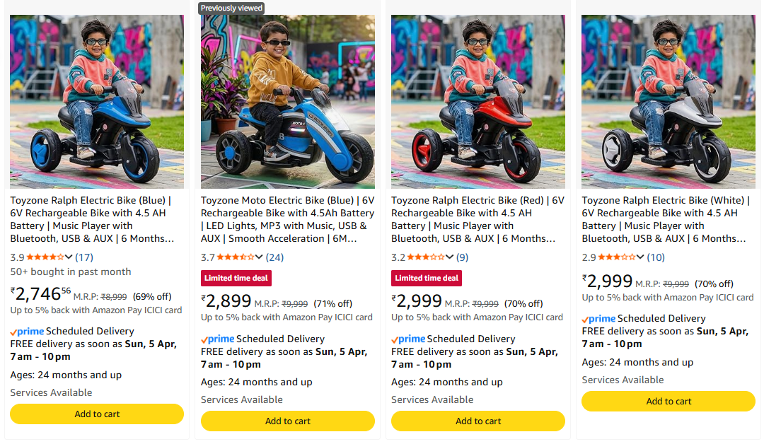 Toyzone Moto Electric Bike at minimum 70% Discount is available on Amazon.
