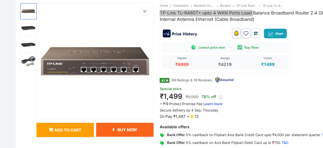TP-Link TL-R480T+ upto 4 WAN Ports Load Balance Broadband Router 2.4 GHz Single Band Internal Antenna Ethernet (Cable Broadband)