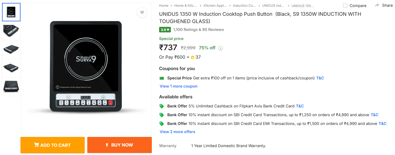 Pigeon By Stovekraft Favourite 1800-Watt Induction Cooktop, Crystal Glass, Black