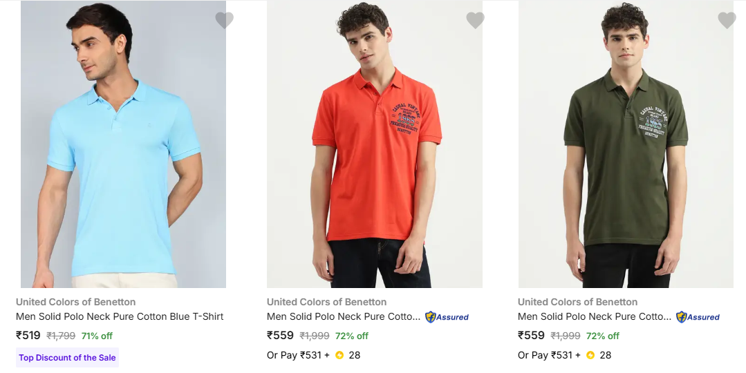 United Colors Of Benetton Men's T-Shirts at minimum 70% Discount is available on Flipkart.