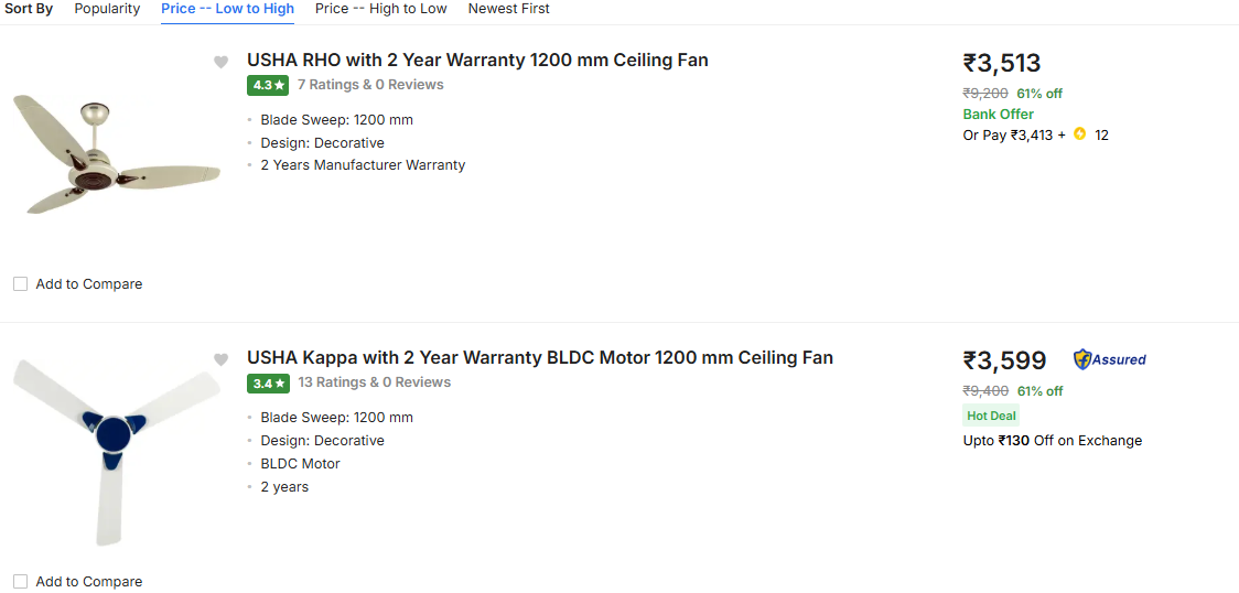 Usha Celling Fans up to 61% off