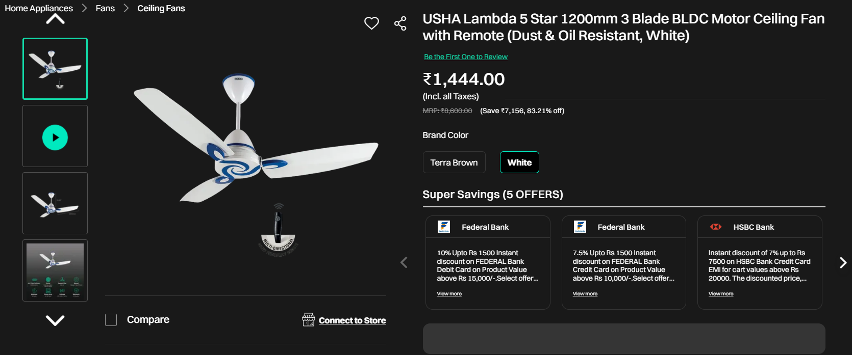 USHA Lambda 5 Star 1200mm 3 Blade BLDC Motor Ceiling Fan with Remote (Dust & Oil Resistant, White).