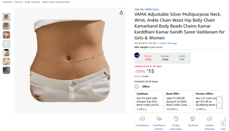 VAMA Adjustable Silver Multipurpose Neck, Wrist, Ankle Chain Waist Hip Belly Chain Kamarband Body Beads Chains Kamar karddhani Kamar bandh Saree Vaddanam for Girls & Women.
