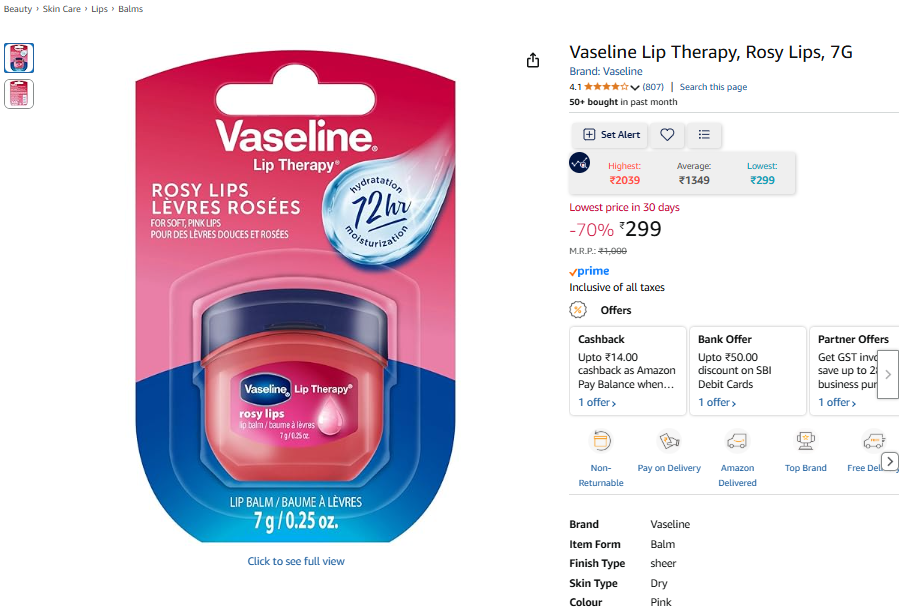 Vaseline Lip Therapy, Rosy Lips, 7G.