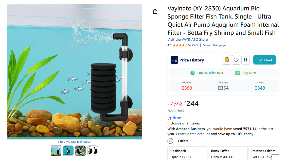 Vayinato (XY-2830) Aquarium Bio Sponge Filter Fish Tank, Single - Ultra Quiet Air Pump Aquqrium Foam Internal Filter - Betta Fry Shrimp and Small Fish.