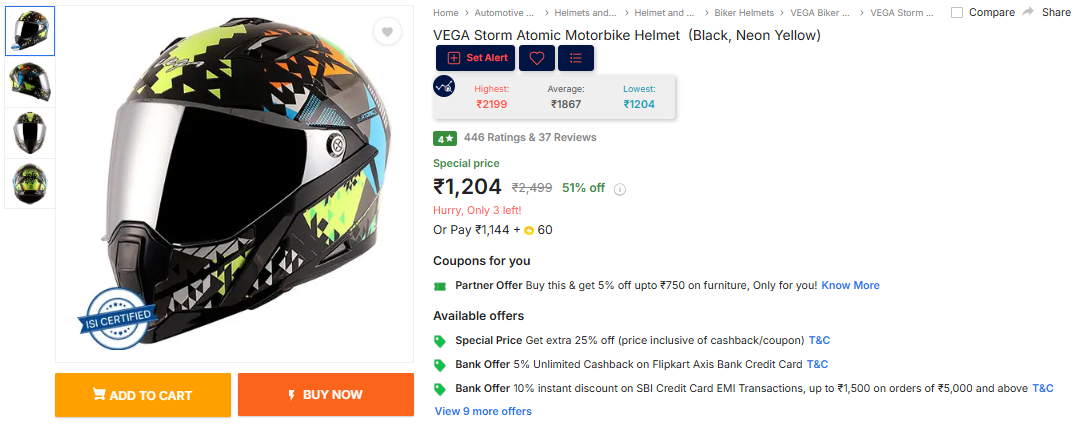 VEGA Storm Atomic Motorbike Helmet (Black, Neon Yellow).