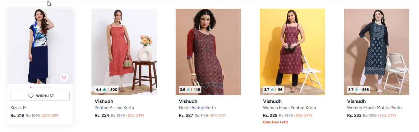Vishudh womens kurtas minimum 80% discount available online in India (80% discount from MRP) on Myntra. Discount: 80%. This deal was updated by @kumkum on 27th March, 2026 at 12:31 PM.