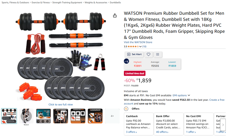 WATSON Premium Rubber Dumbbell Set for Men & Women Fitness, Dumbbell Set with 18Kg (1Kgx6, 2Kgx6) Rubber Weight Plates, Hard PVC 17\' Dumbbell Rods, Foam Gripper, Skipping Rope & Gym Gloves.