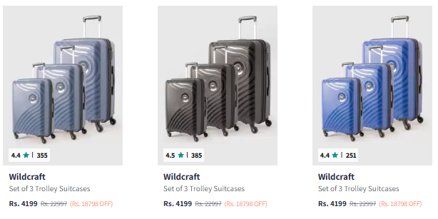 Wildcraft Set Of 3 Onyx Lite Trolley Suitcases Cabin Medium And Large @ ₹4099, Available on Myntra.