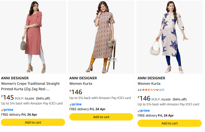 Women's Kurta Upto 94% Discount | Starting @ ₹145 on Amazon.