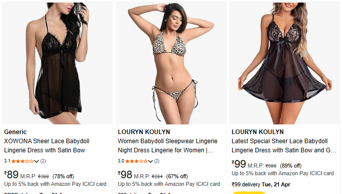 Women's Nightwear Sets Starting @ ₹89 on Amazon.