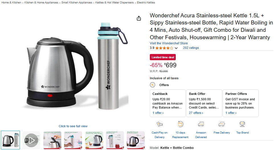 Wonderchef Acura Stainless-steel Kettle 1.5L + Sippy Stainless-steel Bottle, Rapid Water Boiling in 4 Mins, Auto Shut-off, Gift Combo for Diwali and Other Festivals, Housewarming | 2-Year Warranty.