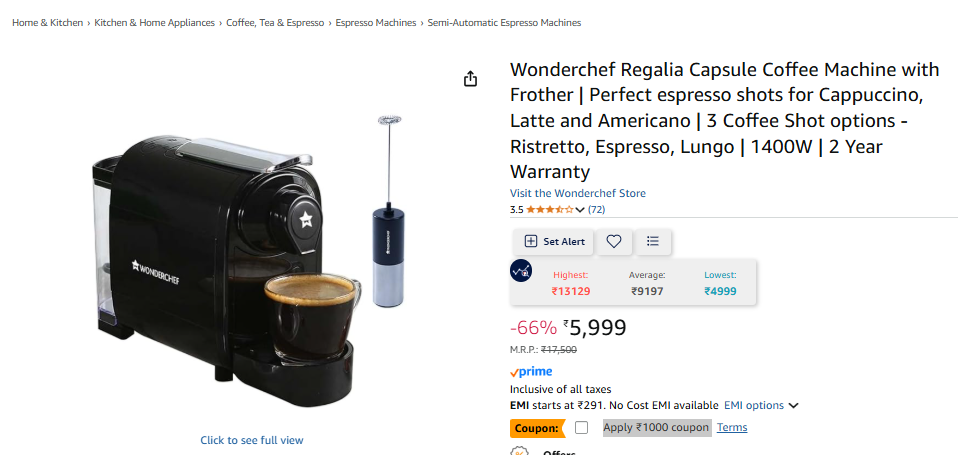 Wonderchef Regalia Capsule Coffee Machine with Frother | Perfect espresso shots for Cappuccino, Latte and Americano | 3 Coffee Shot options - Ristretto, Espresso, Lungo | 1400W | 2 Year Warranty.