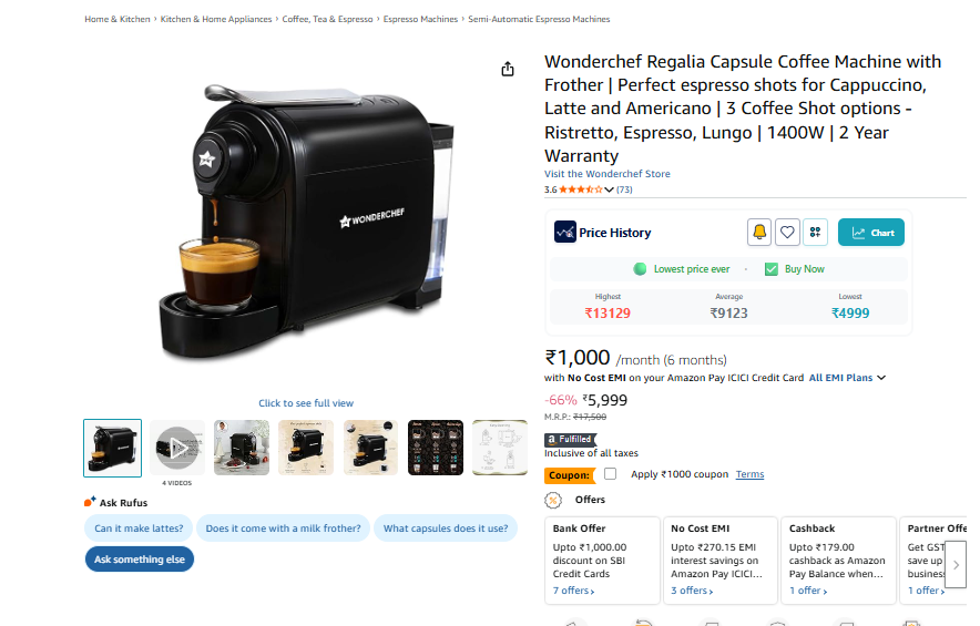 Wonderchef Regalia Capsule Coffee Machine with Frother | Perfect espresso shots for Cappuccino, Latte and Americano | 3 Coffee Shot options - Ristretto, Espresso, Lungo | 1400W | 2 Year Warranty